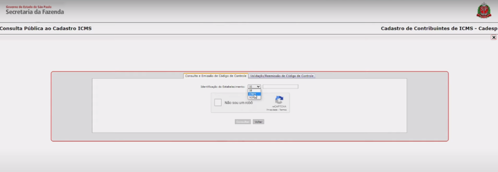 Uma tela se abrirá, na qual você deverá inserir o CNPJ, clicar no Captcha para confirmar sua identificação como humano, depois clicar em “Consultar”.