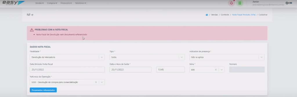 Ou seja, acontece no contexto da emissão de notas fiscais eletrônicas (NF-e) quando se tenta criar uma NF-e com a finalidade de devolver mercadorias.