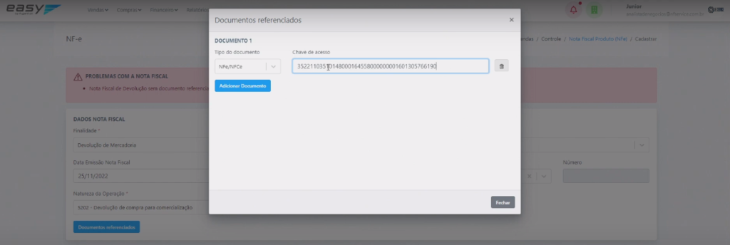Para isso, clique em Documentos referenciados que está em azul. Logo, irá abrir uma janela onde você deverá escolher o Tipo de documento como NFe/NFCe, colar a Chave de acesso e depois Fechar.