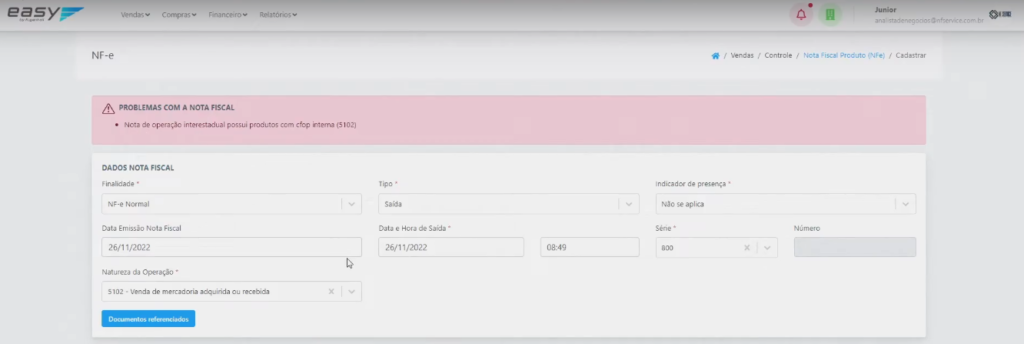 Na tela de Nota Fiscal, veja o problema destacado em vermelho.