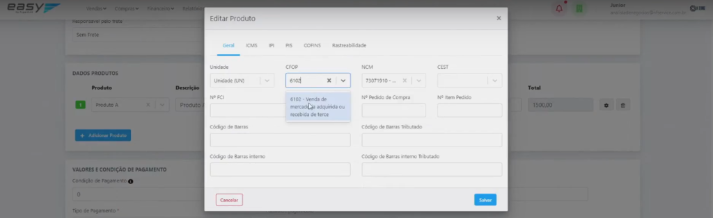 Uma nova janela se abrirá e nela você deverá colocar a CFOP correta, neste caso colocamos a 6102.