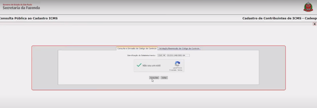 Depois deverá colar este CNPJ, clicar em “Não sou um robô” e depois em Consultar.